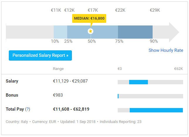 La situazione italiana è invece analizzata da payscale.com che riassume in euro i profitti annui di un social media manager che lavora nel nostro continente. Come è possibile vedere dal grafico sottostante, un SMM alle prime armi può arrivare a guadagnare circa 11600 euro. Maggiore è l’esperienza maturata nel campo, maggiori saranno i profitti. Il salario può anche raggiungere i 30.000 euro. Mediamente il salario annuo si aggira attorno ai 16.800 euro.